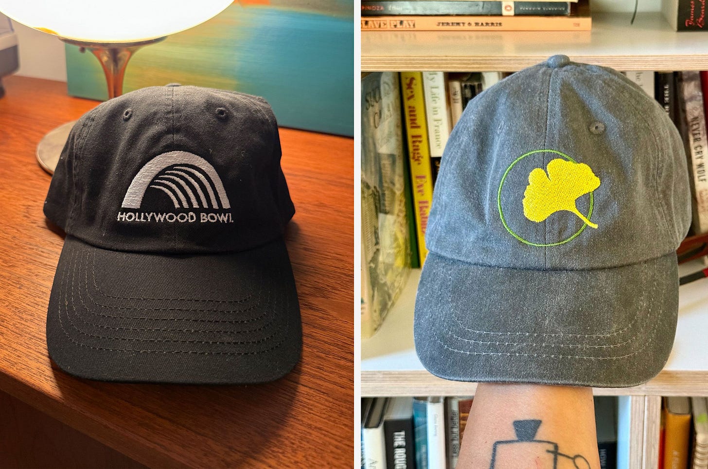 * A couple of cute hats: Lauren picked hers up at the Hollywood Bowl (Dudamel conducted, Seong-Jin Cho played Ravel), and Michael got his (not available online) at Rocky Dale Gardens in Bristol, Vermont, whose show gardens are worth a visit.