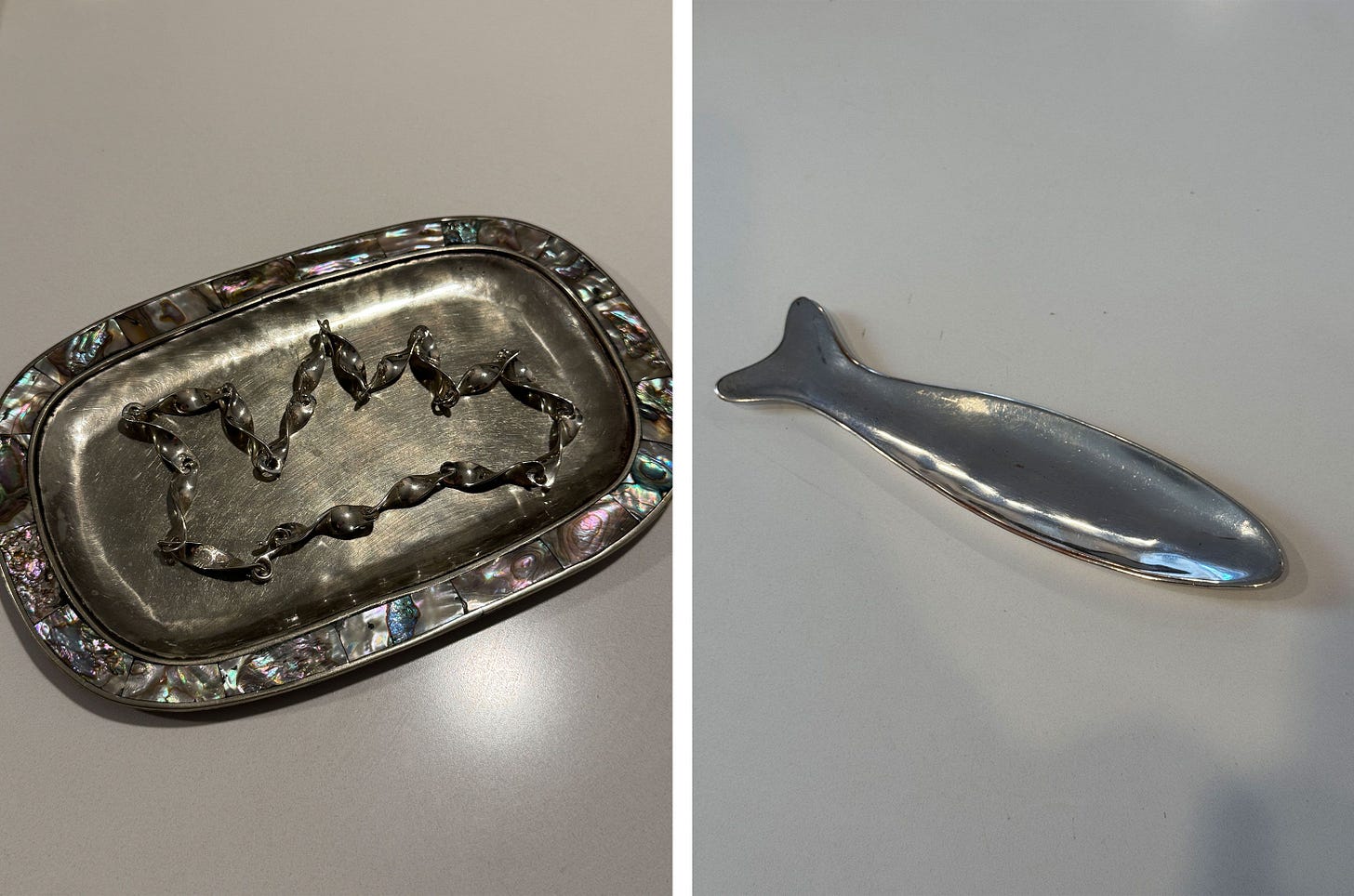“There’s a lot of really good silver from Mexico — incredible silver jewelry, of course, but also things for the home. Both this silver tray and the necklace on it are from Mexico. I do a lot of searching for ‘Taxco,’ which got me to this fish tray that I use for my jewelry. It’s a nice little replacement for a jewelry box.”