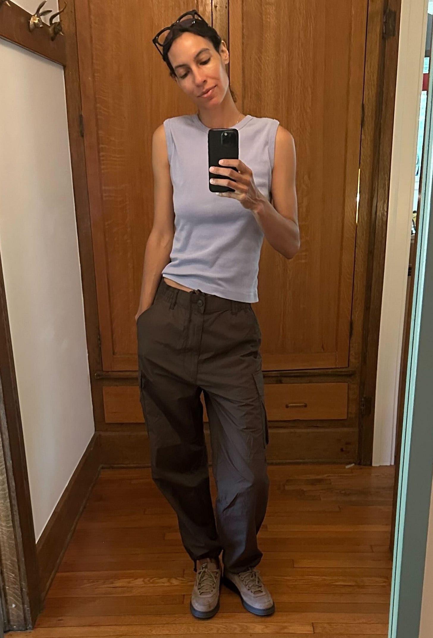 * Simone just bought these $40 mushroom-brown cargo pants from Uniqlo, then she saw them on a stylish woman at LAX. They cinch at the ankles.