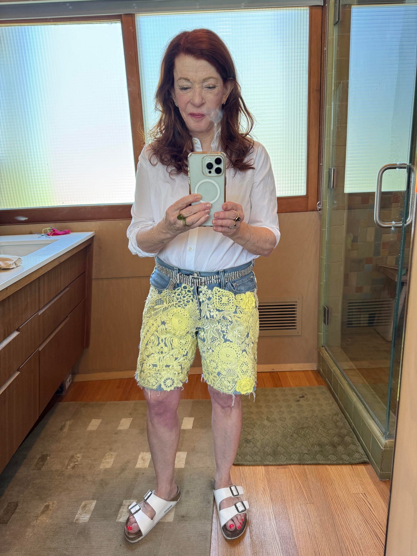 * “Every now and again, I’ll find something crazy. I just found this crazy brand. It’s actually menswear, a tiny, very bespoke company in L.A. called Earthling VIP. I was in a store, and this woman was wearing a pair of shorts that I was obsessed with. They were the coolest shorts I’d ever seen, ever in my life. Lo and behold, they turned out to be this company that mostly does stage clothes for rock stars and stuff. Overall, this stuff is very stage friendly. It’s fairly extreme, but they get these vintage jeans and then cover them with vintage embroidery, and they’re the coolest. Absolutely the coolest. If my house were burning, I’d probably grab these shorts because they’re so cool.”