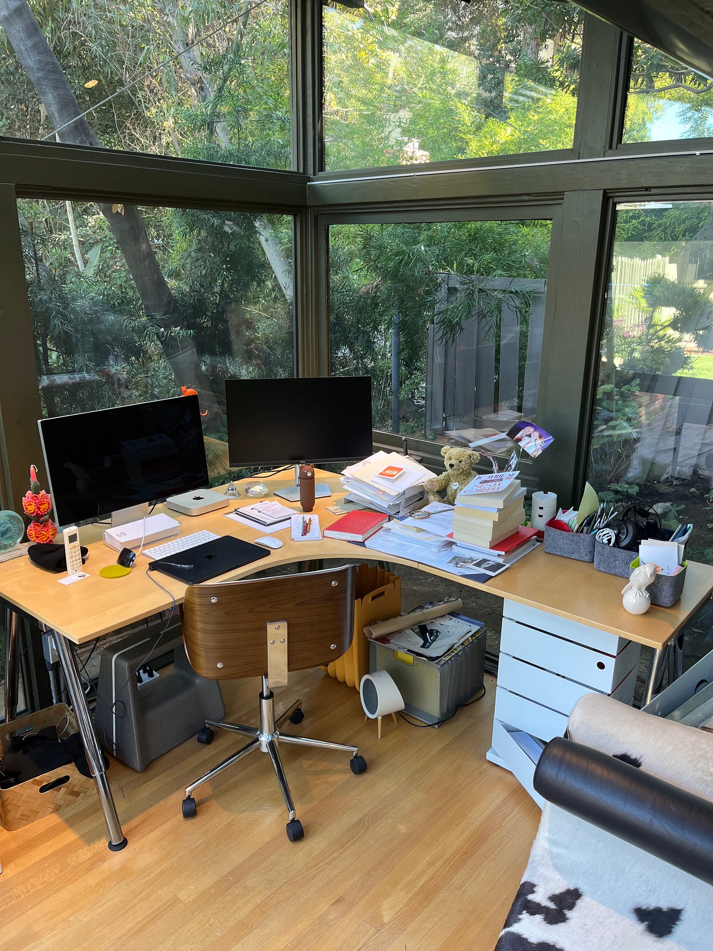 * “This dealer we found in Chatsworth, California, has the best stuff. They’re called Kinetic Modern. And they’re really fantastic. But we also get a lot of stuff at Amsterdam Modern in Silver Lake. But then in my office, this is an Ikea desk. A LEGO typewriter. This is actually made of LEGOs. The carriage moves. It’s so cool.”