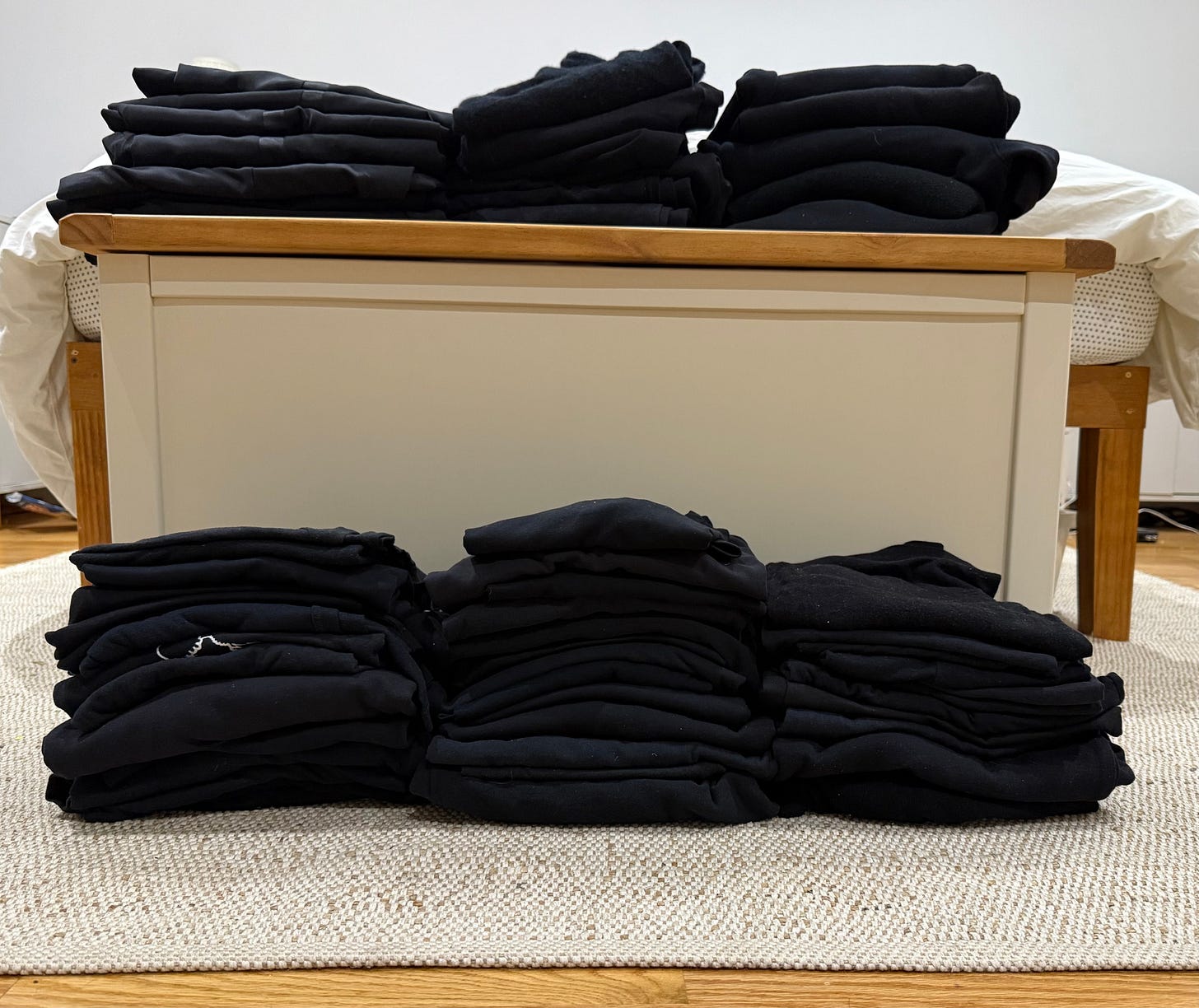 * “I’m the type of person who thinks, This emerald-green blouse looks so great on, and I can see it in an outfit but will never leave the house in it. About ten years ago, I realized that the things that looked good and made me feel good leaving the house were a black T-shirt; then, when it was colder, a black crewneck; and then, when it was much colder, a black jacket over those things. It wasn’t an attempt to create a uniform initially, but as my career got busier, I started almost resenting feeling like it was taking time in the morning to pick something. You know, like, I’m late and I’ve changed my pants three times. This has really helped me.”