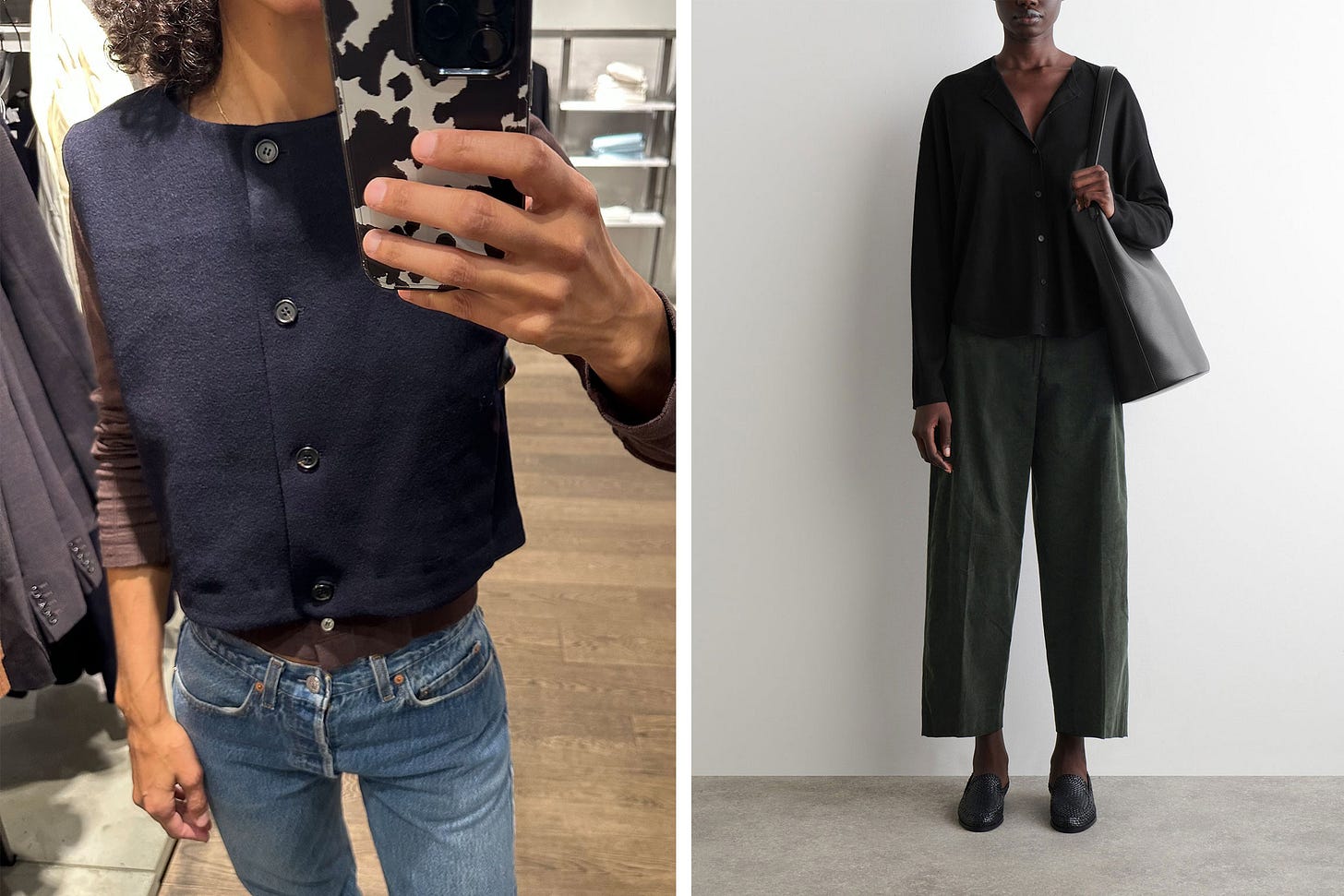 A pretty much perfect $99 boiled-wool COS vest (Simone tried on, can vouch). Also, Winnie finally ordered these green cords she’s had in her cart for weeks. Worth signing up for a restock notification if your size isn’t available — we’ve noticed sizes coming back in stock repeatedly.