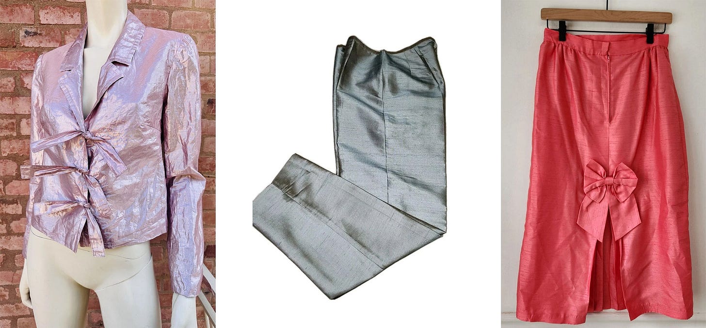 New York features writer Madeline Leung Coleman has been searching for raw-silk pieces in anticipation of holiday-party season. This coral pencil skirt with bow bustle, a ’90s Romeo Gigli iridescent pink jacket with ties, ’60s Emilio Pucci raspberry pants, silver trousers, tangerine Escada raw-hem pants, and a sleeveless silk tunic from Dosa in a Gatorade blue are all in the running. And a similarly bright-blue Agnès B. snap cardigan — in dress form — that would “make a great light coat or layering piece,” according to Madeline.